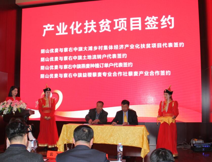 會(huì)議期間,內(nèi)蒙古陰山優(yōu)麥?zhǔn)称酚邢薰具€分別與察右中旗大灘鄉(xiāng)集體經(jīng)濟(jì)產(chǎn)業(yè)化扶貧項(xiàng)目代表、察右中旗土地流轉(zhuǎn)戶代表、察右中旗燕麥種植訂單戶代表和察右中旗易稷藜麥專業(yè)合作社進(jìn)行了現(xiàn)場簽約。