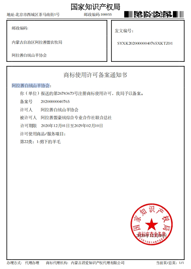 阿拉善白絨山羊協(xié)會已收到國家知識產(chǎn)權(quán)局下發(fā)的4項(xiàng)商標(biāo)使用許可備案通知書